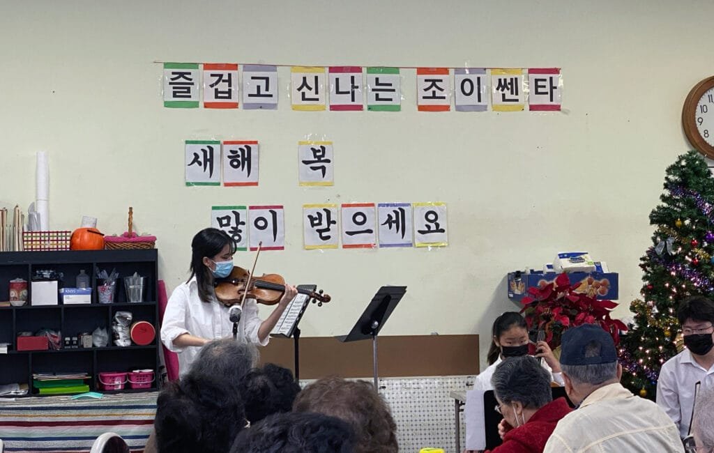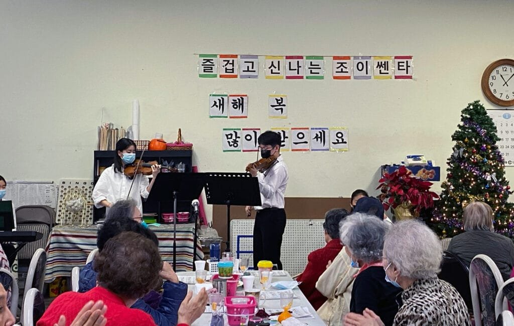 We started our journey and new year by conducting our performance at Joy Adult Day Healthcare in Norwalk, California. Rubi played Meditation from the Opera Thaïs, Jon played Salut D’amour Op. 12, and together they played a Korean new year song, Seollal (설날). Additionally, the entire group – Rubi, Jon, Shinbi and Erin – played a very famous Korean folk song called Arirang (아리랑) together.